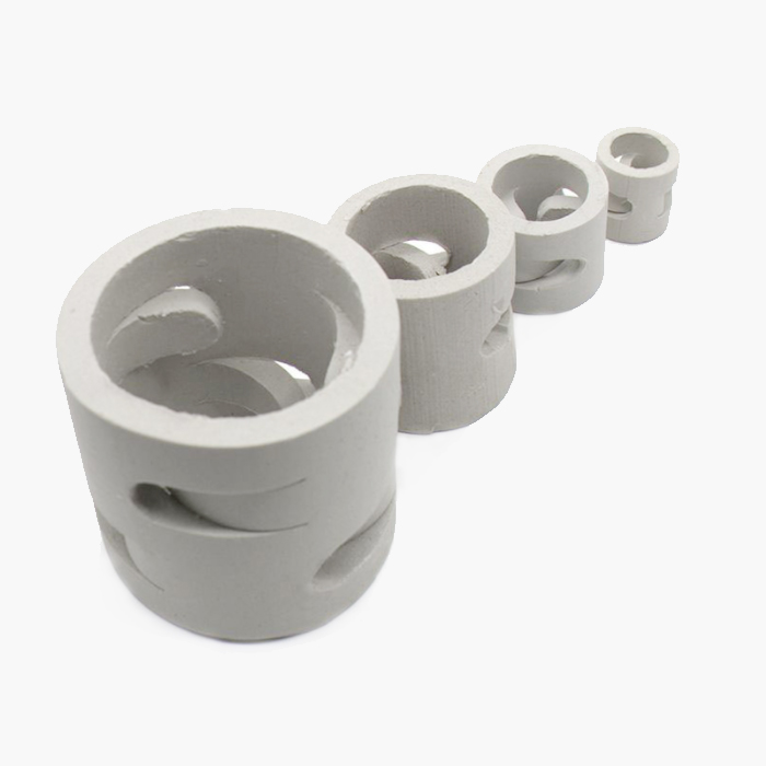 陶瓷鮑爾環(huán)填料是一種高徑相等的開(kāi)孔型填料,每層窗孔有5個(gè)舌葉,每個(gè)舌葉內(nèi)彎指向環(huán)心,上下兩層窗孔的位置相反錯(cuò)開(kāi),一般開(kāi)孔面積約占環(huán)壁總面積的30%左右。這種結(jié)構(gòu)改善了汽液分布,充分利用了環(huán)的內(nèi)表面,從而使得填料塔內(nèi)的氣體和液體能夠從窗體自由通過(guò)。