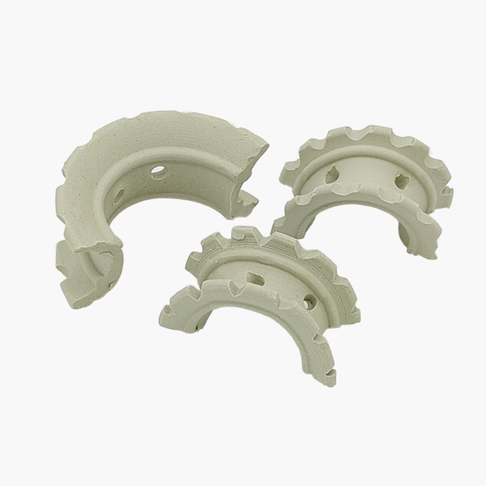 陶瓷異鞍環(huán)填料是在矩鞍環(huán)填料的基礎(chǔ)上加以改進(jìn)的新型填料,將矩鞍填料的平滑弧形側(cè)面改為鋸齒形或紋紋凸起的側(cè)面。這樣在填料床層內(nèi),增加了填料間接觸的空隙,使之更有利于氣體和液體在填料層中的流動(dòng)和擴(kuò)散。