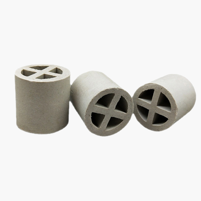 陶瓷十字隔板環(huán)填料是基于增加填料的比表面積,從而強(qiáng)化傳質(zhì)效率而開(kāi)發(fā)出來(lái)的。 其形狀是在拉西環(huán)中間增設(shè)了十字隔板。 一般來(lái)講,這種填料由于尺寸較大,僅適用于整體堆徹,目前一般只作為亂堆填料的塔底支撐分布層用。